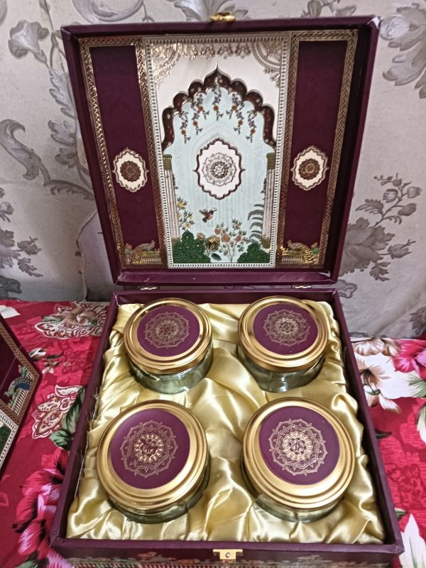 Inside, the box opens to reveal four elegant glass jars with gold lids, each beautifully placed on silky satin fabric. These jars can be filled with assorted dry fruits, sweets, or customized treats, making it a perfect blend of invitation and gifting.
