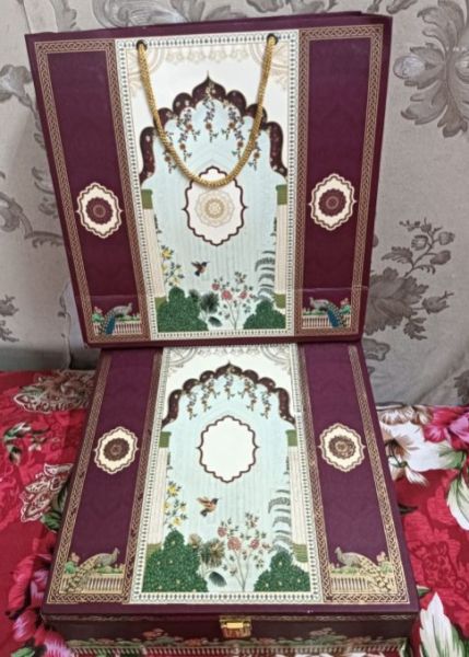 The box is complemented by a matching designer carry bag, ensuring easy handling while maintaining a rich and regal look — ideal for premium wedding invitations, festive hampers, or luxury gifting.